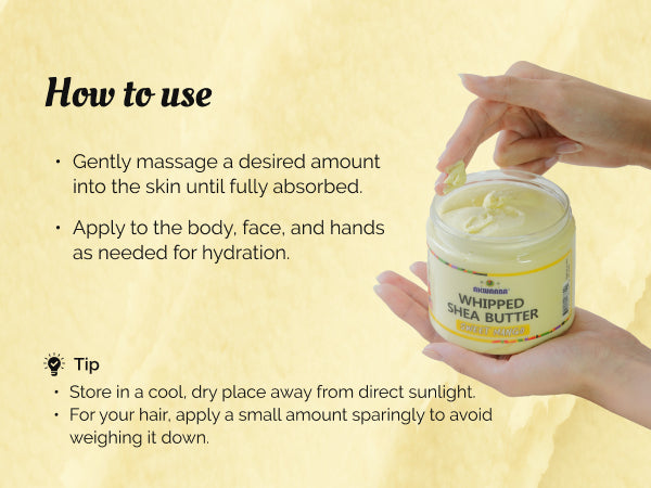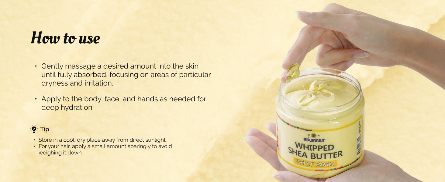- Why You'll Love it: AKWAABA Whipped Shea Butter is formulated to hydrate and soothe the skin. This nutrient-rich moisturizer helps to nourish and protect your body, face, and hair. Ideal for all skin and hair types.