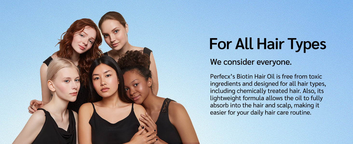 - For All Hair Types 🤝: We consider everyone. Perfecx’s Biotin Hair Oil is free from toxic ingredients and designed for all hair types, including chemically treated hair. Also, its lightweight formula allows the oil to fully absorb into the hair and scalp, making it easier for your daily hair care routine.