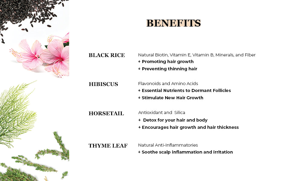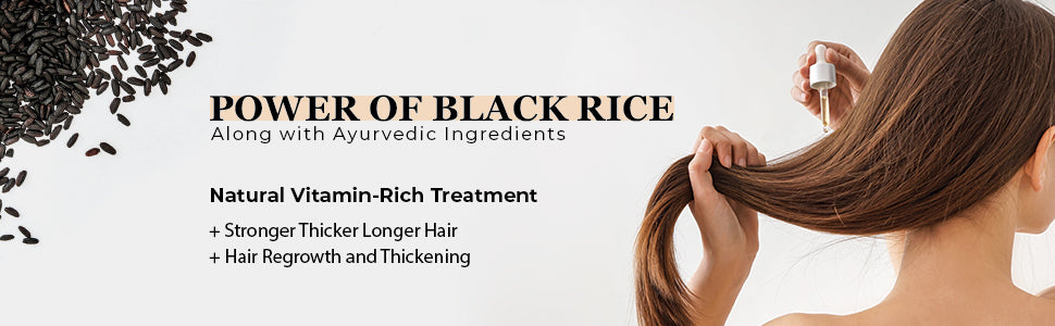 - Ayurvedic Formulation: Our hair oil follows traditional Ayurvedic principles, combining various herbal ingredients renowned for their hair-nourishing properties. These ingredients, along with real black rice, work synergistically to improve the overall health of your hair.