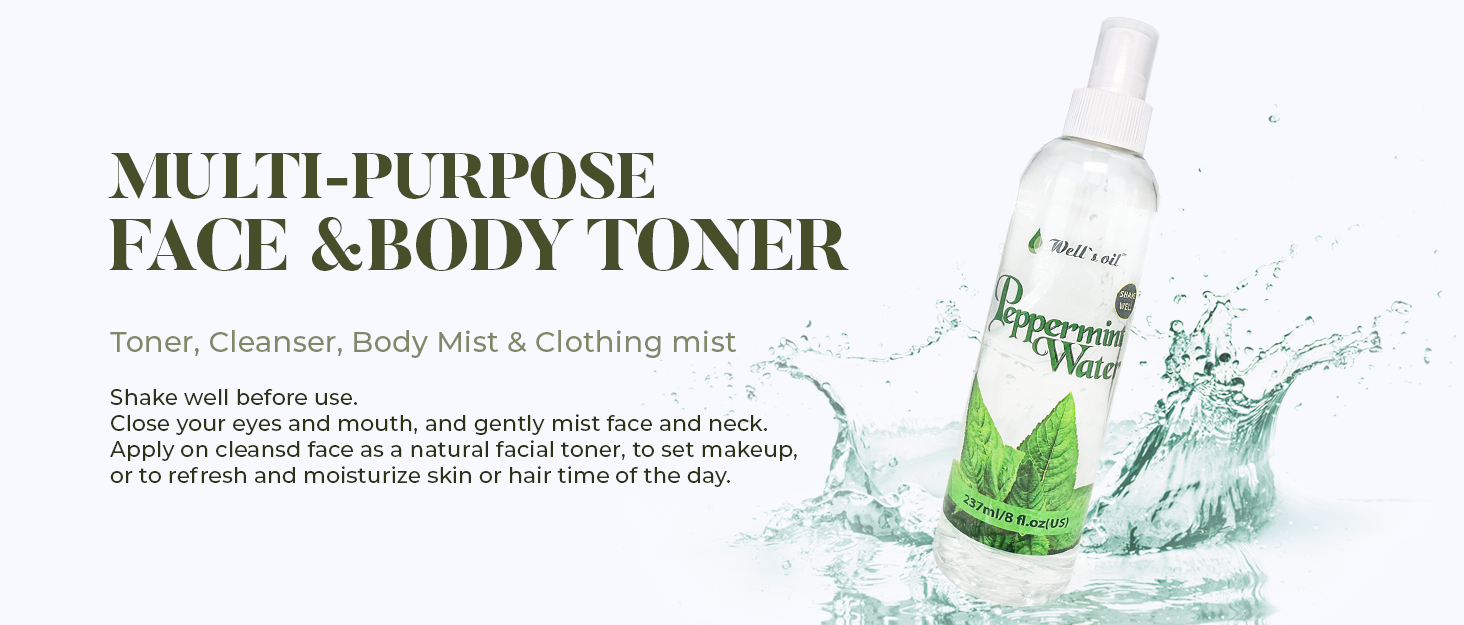 - How to Use: Well's Peppermint Water can be used whenever hydration is needed. It is ideal as a hair & scalp mist or a skin toner by spraying directly on the skin or mixing with creams and lotions.